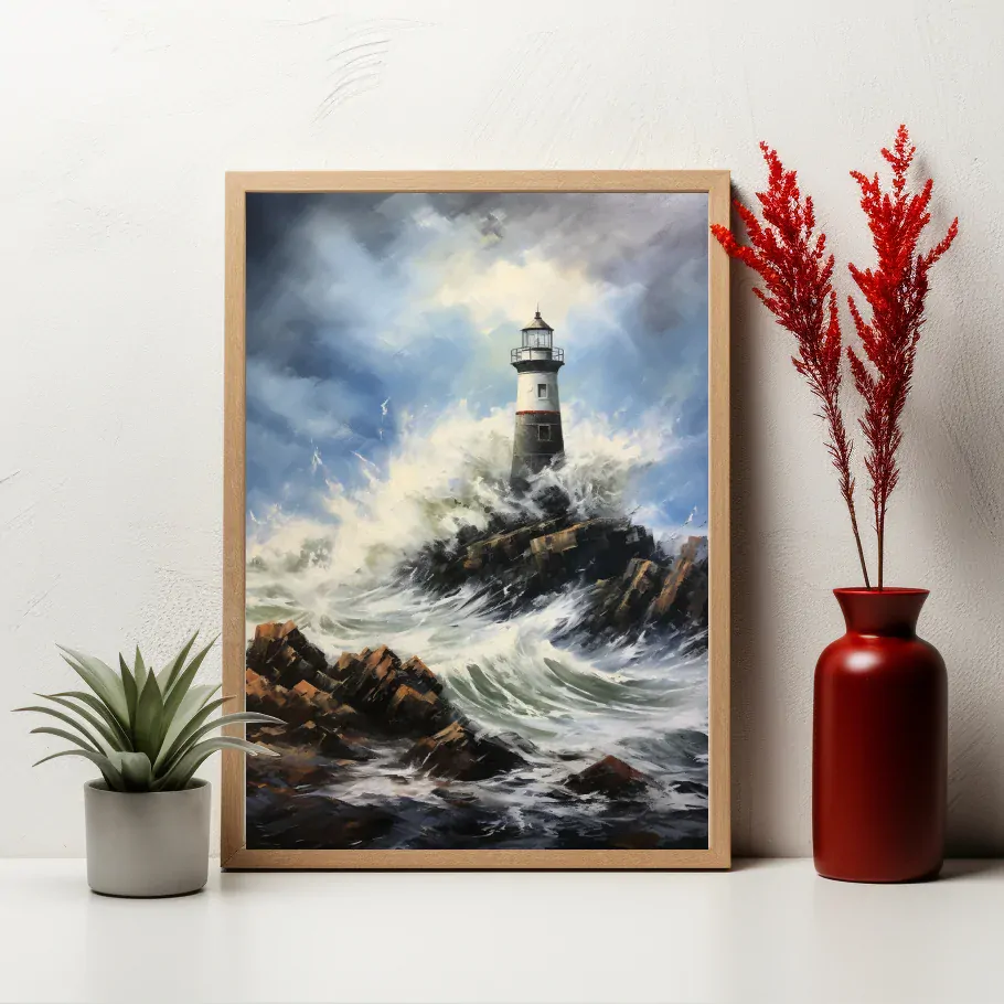Černobílý maják stojí osamoceně na útesu, čelící neúprosným vlnám rozbouřeného moře. Modré nebe na obzoru zvýrazňuje jeho kontrastní postavu. Obraz přináší dojem izolace a odhodlání, které maják vyvolává svým jedinečným postavením.