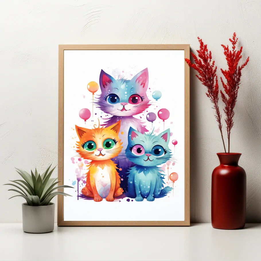 Tři rozkošné barevné kočky se šťastně oslavují v obraze, okolo nich létají malé balónky v různých barvách, přinášející radost a hravost do jejich kočičího světa.