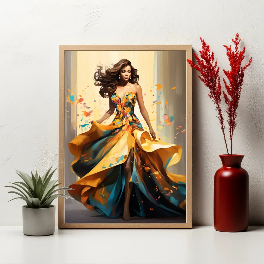 Tento digitální obraz je inspirován krásou přírody a módy. Obraz zobrazuje ženu v nádherných květinových šatech, které ladí s podzimním prostředím. Šaty mají vysoký rozparek, který odhaluje ženy nohu a dodává obrazu šmrnc. Ženy vlasy jsou volně rozpuštěné a vlají ve větru. Tento obraz je perfektní pro ty, kteří milují romantiku a eleganci.