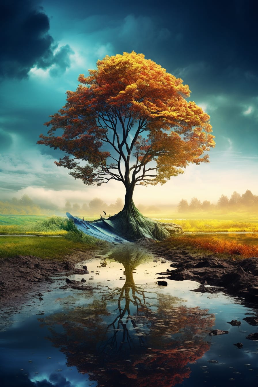 Řeka pozvolna ústí k majestátnímu podzimnímu stromu, jehož větve se rozprostírají jako náruč matky přivítání nového dne. Voda a země se propojují, vytvářejíce harmonickou symfonii přírody a zahalujíce krajinu do podzimních odstínů.