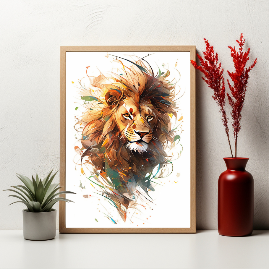 Barevný portrét hlavy lva zvýrazňuje jeho majestátnost a sílu, zatímco jeho pronikavý pohled odhaluje odhodlání a odvahu krále divočiny.