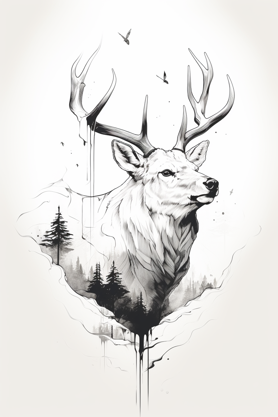 Dvojitá expozice v obraze zachycuje kouzlo lesa a jeleního obrysu, které propojuje přírodu a magii do jednoho.