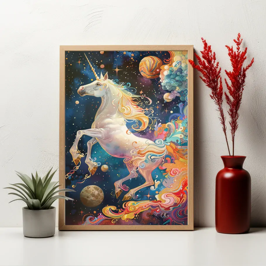 Půvabný jednorožec je bytost z pohádkových říší, jehož krása a elegance jsou zářivější než hvězdy na nebeském obloze. Jeho jemná srst a křišťálový roh představují spojení síly a něhy, které okouzluje každého, kdo mu přijde blízko. V jeho přítomnosti se ožívá magický svět fantazie a snů, a jeho půvab nás provází do neuvěřitelných dobrodružství a pohádek.