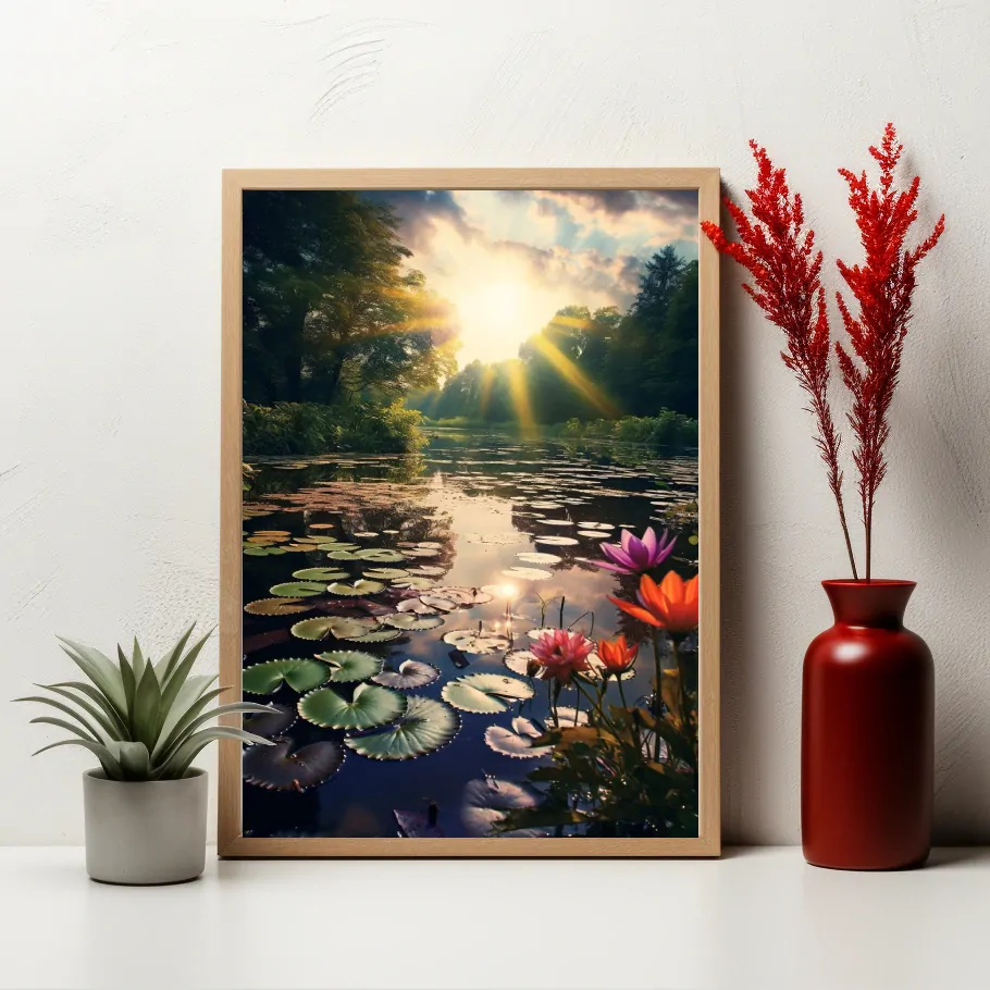 V okouzlujícím obraze se jezírko proměnilo v pohádkový svět leknínů, kteří tančí na hladině začarovaného rybníka. V pozadí vzkvétá východ slunce, jehož paprsky zaobalují scénu do nádherných růžových a oranžových odstínů, přinášejících nový den plný naděje a krásy.