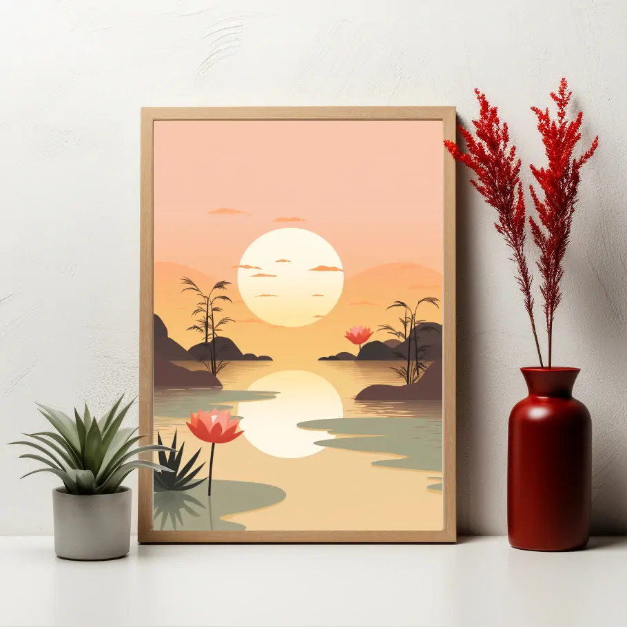 V této magické krajině západ slunce oživuje řeku a okolní krajinu do nádherného růžového nádechu. Paprsky slunce se tajemně líně odrážejí na hladině řeky, tvoříce harmonii s růžovým obzorem, který pohlcuje pozornost a zvěčňuje okamžik, kdy se příroda mění v nebeské umění.