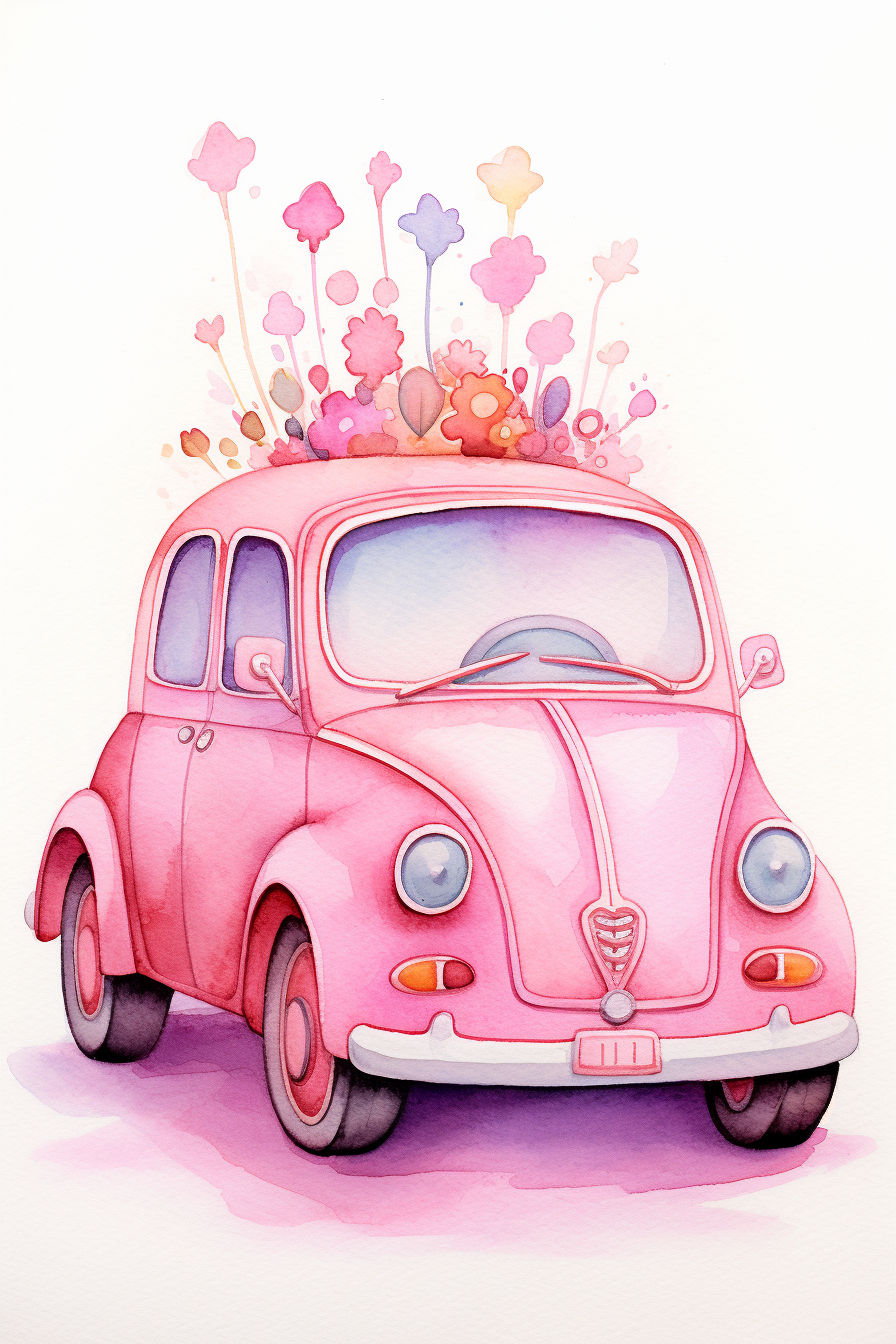 Malovaný obraz zachycuje růžový Volkswagen Brouk, který nadšeně putuje z veselé oslavy. V pozadí na bílém plátně jsou umělecky vytvořené obrysy nádherných balonků, které dodávají scéně lehkosti a hravosti. Celkový dojem je zářivě pozitivní a plný radosti, přenášející diváka do pohádkového světa.