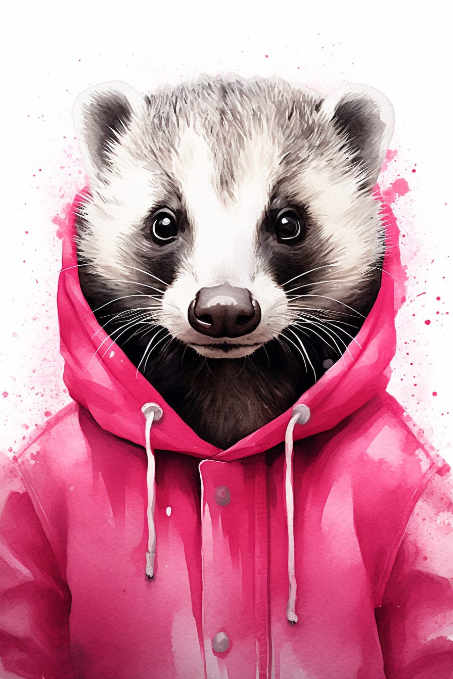 Tento roztomilý kreslený obraz zachycuje velkého mývala, který je oblečen do pohodlné růžové mikiny. Jeho rozesmátý výraz a nadýchaná mikina přinášejí dojem radosti a pohody, kdy se mývalovi dostává teplo a něhy v tomto útulném a veselém obraze.