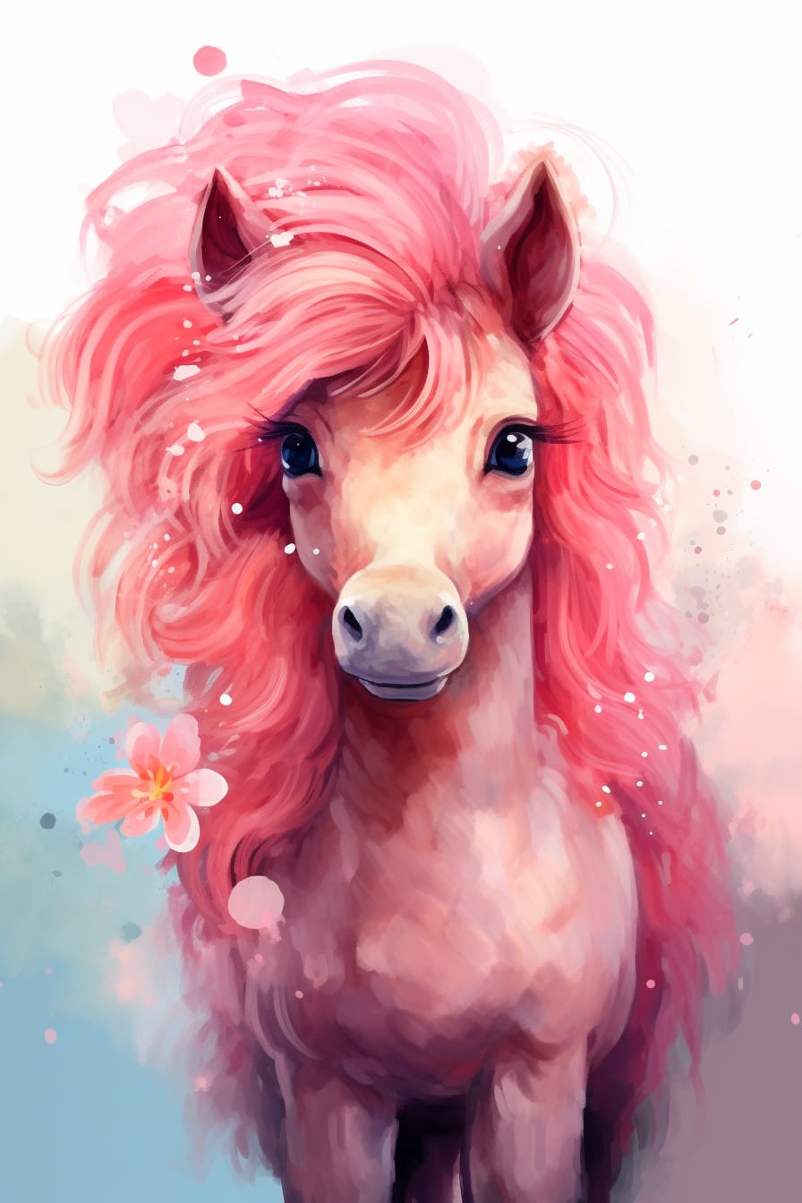 V tomto kouzelném obraze zazáří kreslený kůň s nádhernou růžovou hřívou na čistém bílém pozadí. Jemné linie a barevná harmonie vtahují diváka do snového světa, kde se otevírá brána do kouzelného světa fantazie a příběhů.