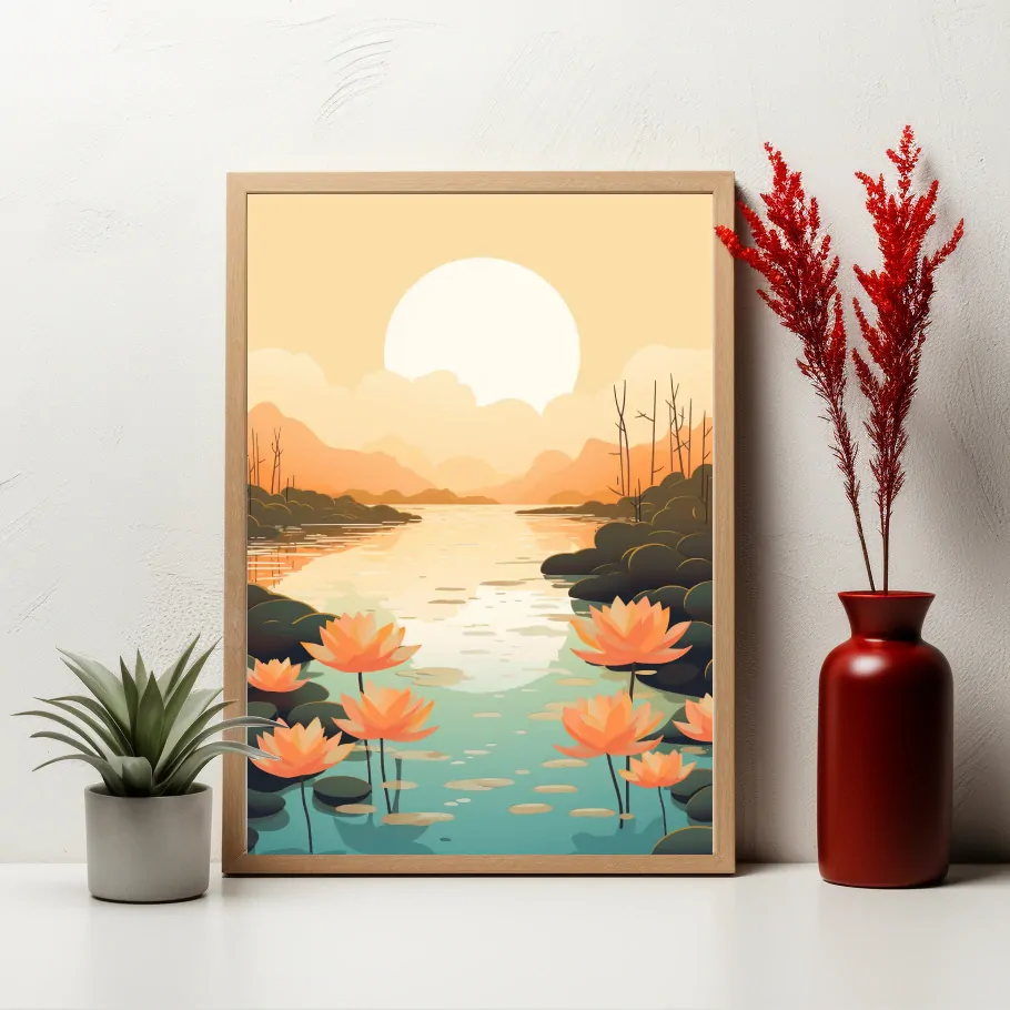 Západ slunce barví krajinu do nádherného růžového nádechu, kdy jemné odstíny se odrážejí na hladině klidné řeky. Scéna přináší pocit klidu a romantiky, kdy slunce se loučí s dnem a září ve své plné kráse nad rozpínající se řekou.
