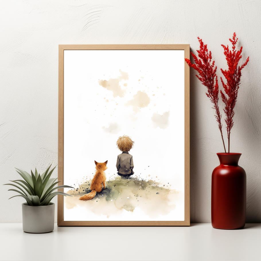 Tento kouzelný plakát zachycuje intimní moment mezi Malým princem a jeho věrnou liškou, jak společně pozorují nebesa. Malý princ a delikátní akvarelové odstíny a jemné čáry vyvolávají pocit klidu a zamyšlenosti, což z něj činí ideální doplněk pro každý domov hledající dotek elegance a inspirace.