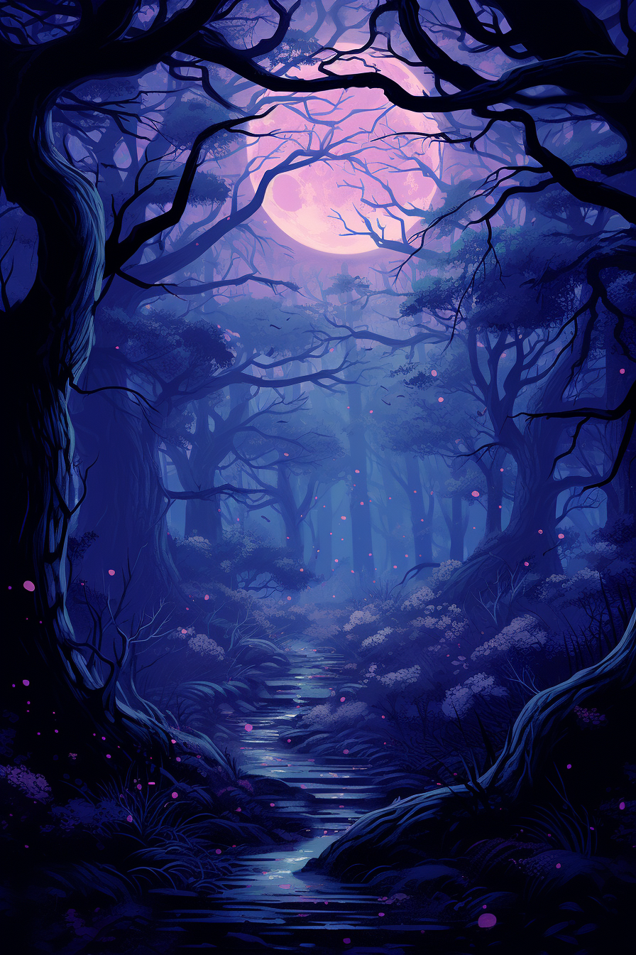 V tomto obrazu je cesta v temném lese zahalená v atmosféře soumraku, kdy měsíc vzdáleně svítí na obzoru. Zastavit se na této stezce přináší smělost a odvahu objevovat neznámé.