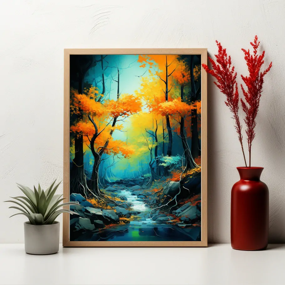 V temnotě lesa se vytrácí světlo dne, kdy podzimní stromy svírají cestu v objetí svých vyschlých větví. Lesní pestré barvy vytvářejí závoj tajemství, který láká k objevování skrytých kouzel pod každým krokem.