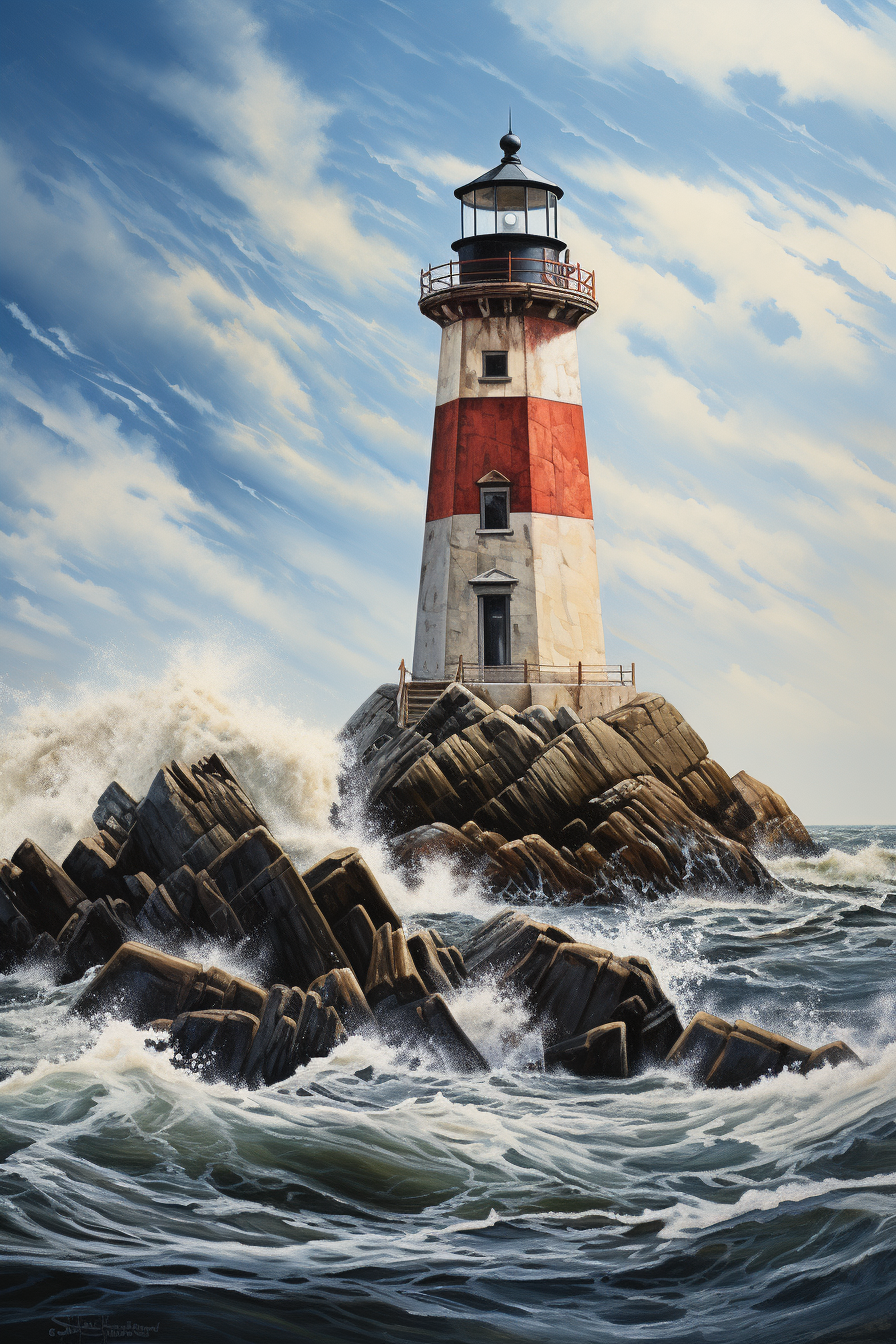 Červenobílý maják stojí jako symbol naděje na útesu, připomínající nám, že i v bouřlivých časech existuje světlo a směr. Rozevřené moře a modré nebe na obrazu podtrhují jeho význačnost a sílu. Obraz přináší dojem víry v lepší zítřky a jistoty.