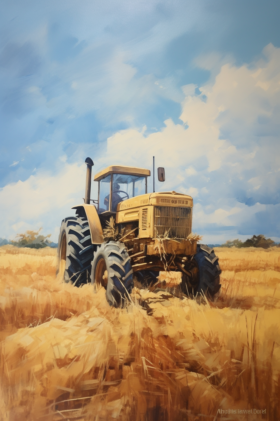 Uprostřed rozkvetlého obilného pole stojí traktor, připravený na dobrodružství. Modré nebe na obzoru rozjasňuje krajinu, zatímco obilí se hladí na vánek. Obraz zachycuje krásu venkovského prostředí a sílu technologie, která pomáhá oživovat úrodu na polích.