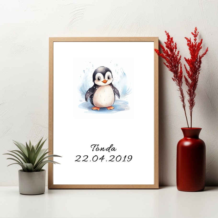 Osobní dotek umění! Objednejte si tento roztomilý plakát tučňáka a přidejte vlastní text, jméno nebo datum, aby byl jedinečným a osobním dárkem nebo dekorací.