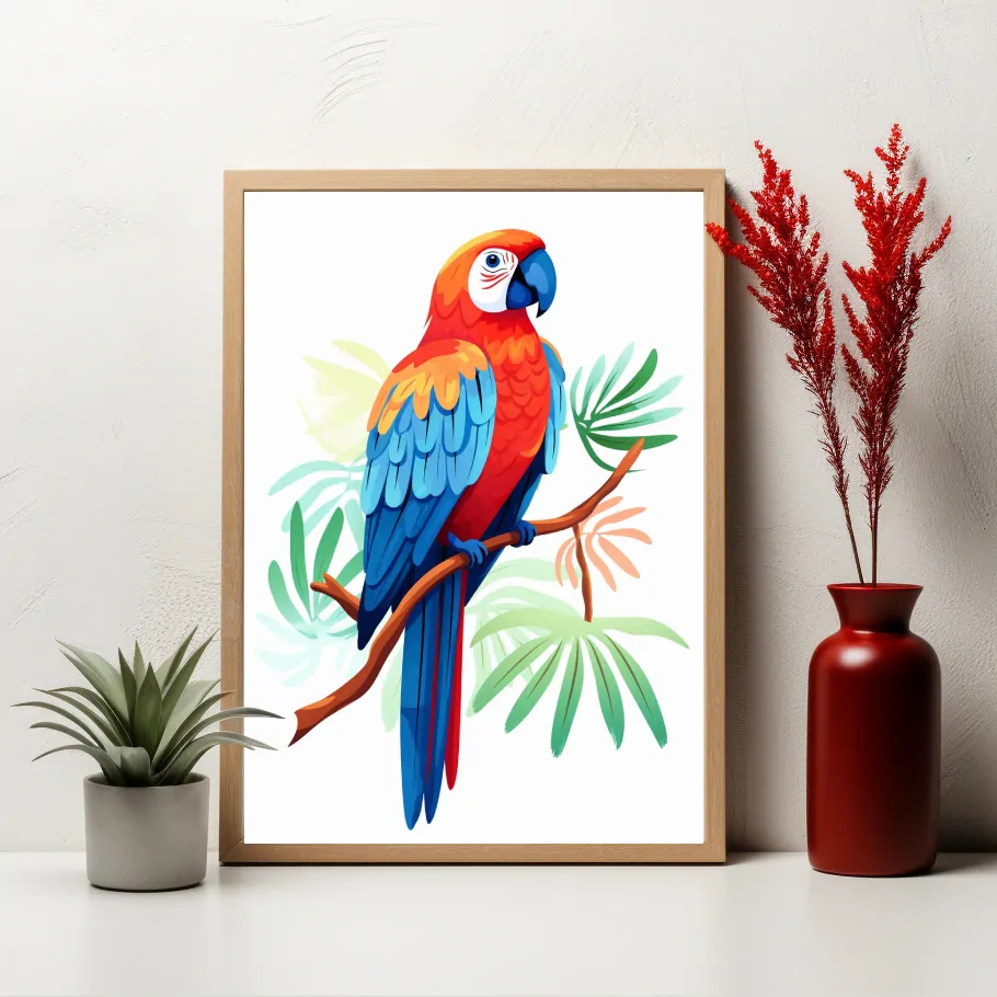 Na této roztomilé dětské malbě se objevuje barevný papoušek, který sedí s úsměvem na větvi. Jeho pestře zbarvená peříčka a radostná nálada okouzlují dětskou představivost, zvouc diváka do tropického ráje plného barev a radosti.