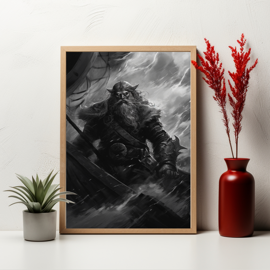 Vikingský válečník v plné zbroji vedle rozbouřeného moře stojí jako symbol nezlomného ducha boje v návalu bouře. Jeho odvaha a vytrvalost ho provází i v nejtěžších okamžicích. Obraz vyvolává pocit napětí a dramatického souboje.