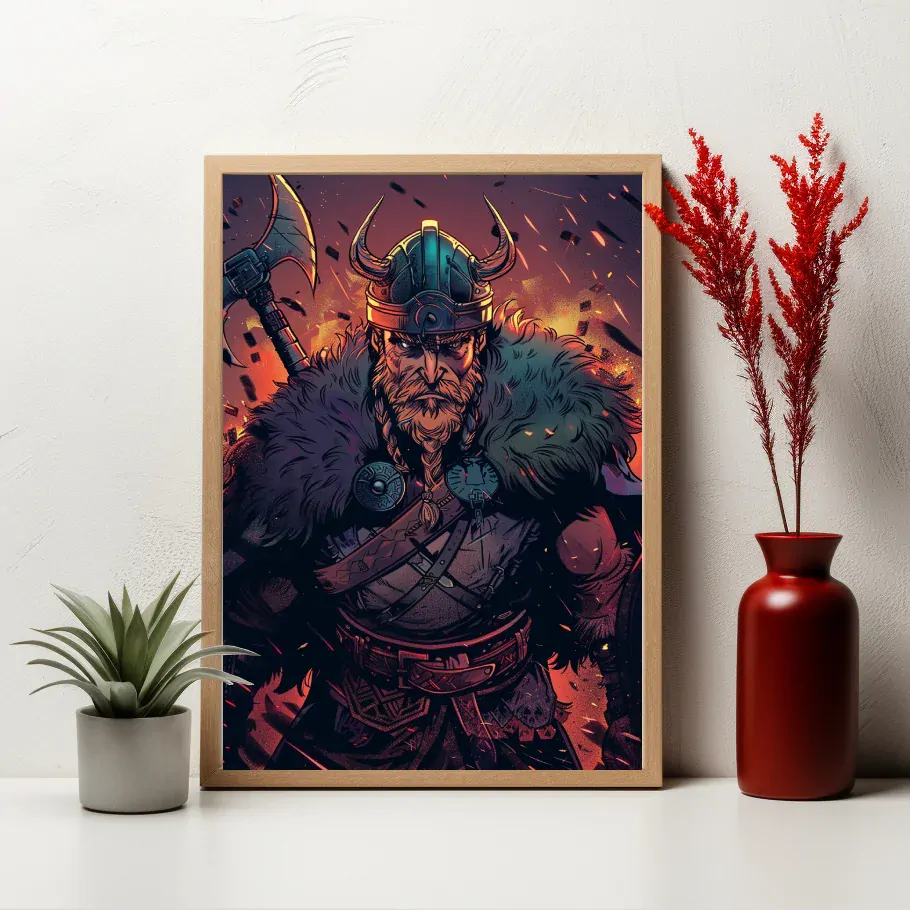 Vikingové u ohně sedí kolem plápolajícího ohně, jehož světlo rozjasňuje jejich tváře a zahřívá jejich těla pod temnou oblohou. S meči u nohou a pohárem moku v ruce sdílejí příběhy o slavných dobyvatelských činech a výpravách do vzdálených zemí, posilujíce si pouto bratrství a odhodlání k dalším dobrodružstvím. V této chvíli spojení s ohněm cítí sílu svých předků a vášeň pro dobytí a slávu.