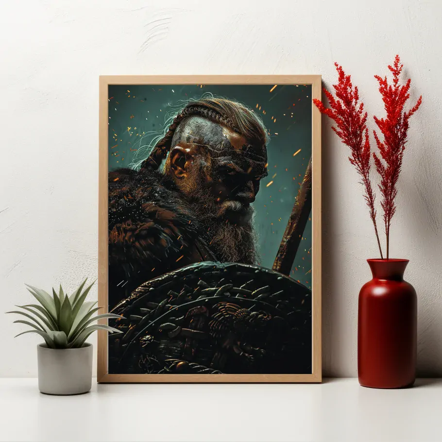 Vikingové v boji se řítí vpřed s divokým válečným pokřikem, jejich meče se lesknou v odlesku slunce a štíty chrání jejich těla před útoky nepřátel. Jejich srdce bije rytmicky jako bubny války, zatímco jejich odhodlání a statečnost přetrvávají i v nejtvrdších okamžicích. V té chvíli se stávají nezdolnými válečníky, kteří bojují s nezlomnou vůlí a hrdinstvím, nikdy nepolevujíce ve snaze získat slávu na bojišti.