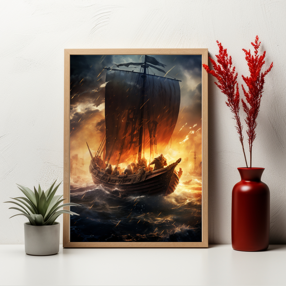 Velká vikingská loď, pyšně stojící na rozbouřeném moři s nafouknutou plachtou, vyjadřuje pýchu a sílu vikingů. Jejich hrdinské srdce vede je k novým výzvám a dobyvatelským činům. Obraz vyvolává pocit úcty a obdivu k těmto odvážným námořníkům.