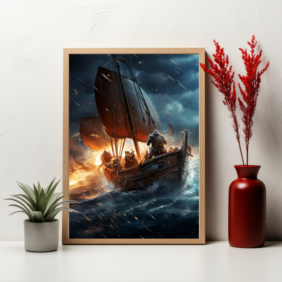 Vikingská loď s velkou plachtou se statečně vznáší nad rozbouřeným mořem. Její posádka projevuje nezlomnou odvahu a vytrvalost v tváři nástrah přírodních živlů. Obraz vyvolává dojem dobrodružství a statečnosti, kterou vikingští námořníci přinášeli na každé své cestě.