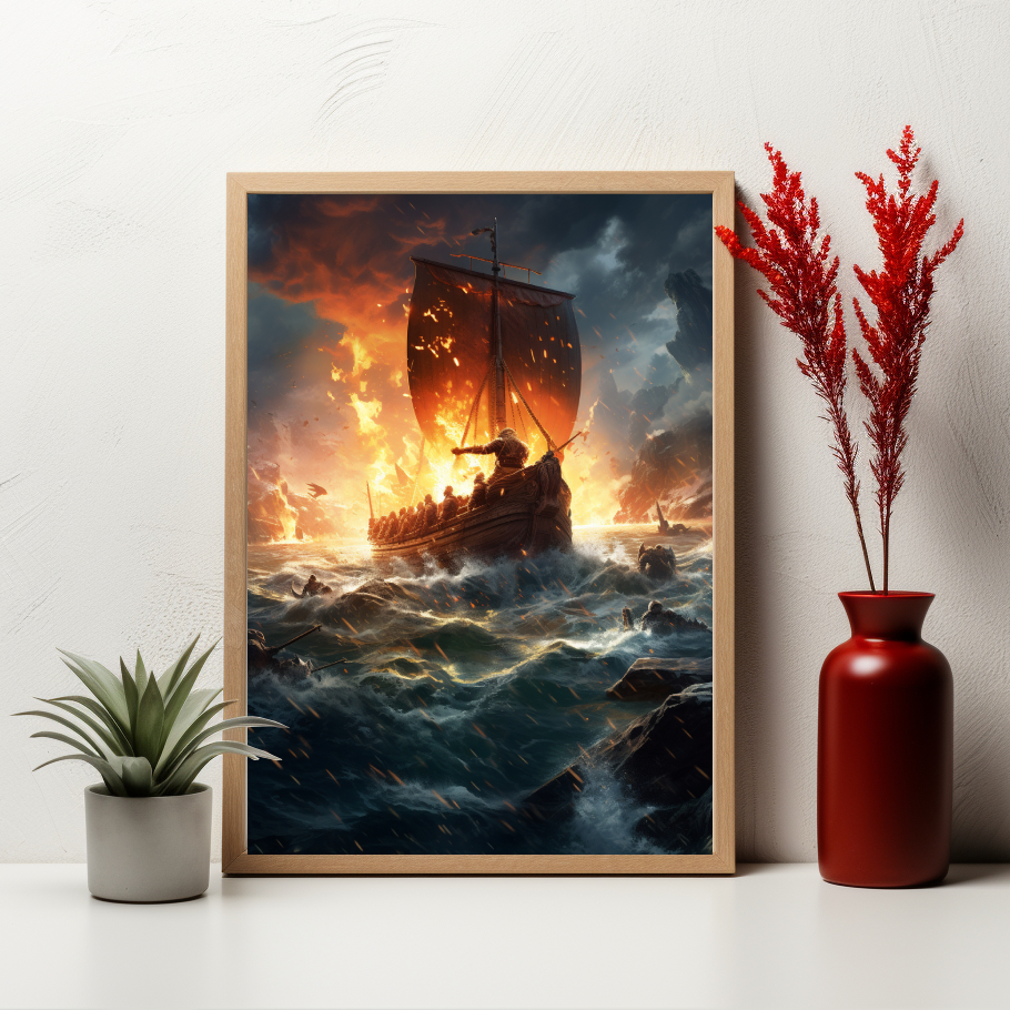 Vikingská loď klouže rychlostí větru po rozbouřeném moři. Její plachta je naplněna vánkem, který ji posouvá kupředu vstříc novým dobrodružstvím. Obraz vyvolává pocit svobody a energie, kterou přináší plavba na těchto vznešených lodích.