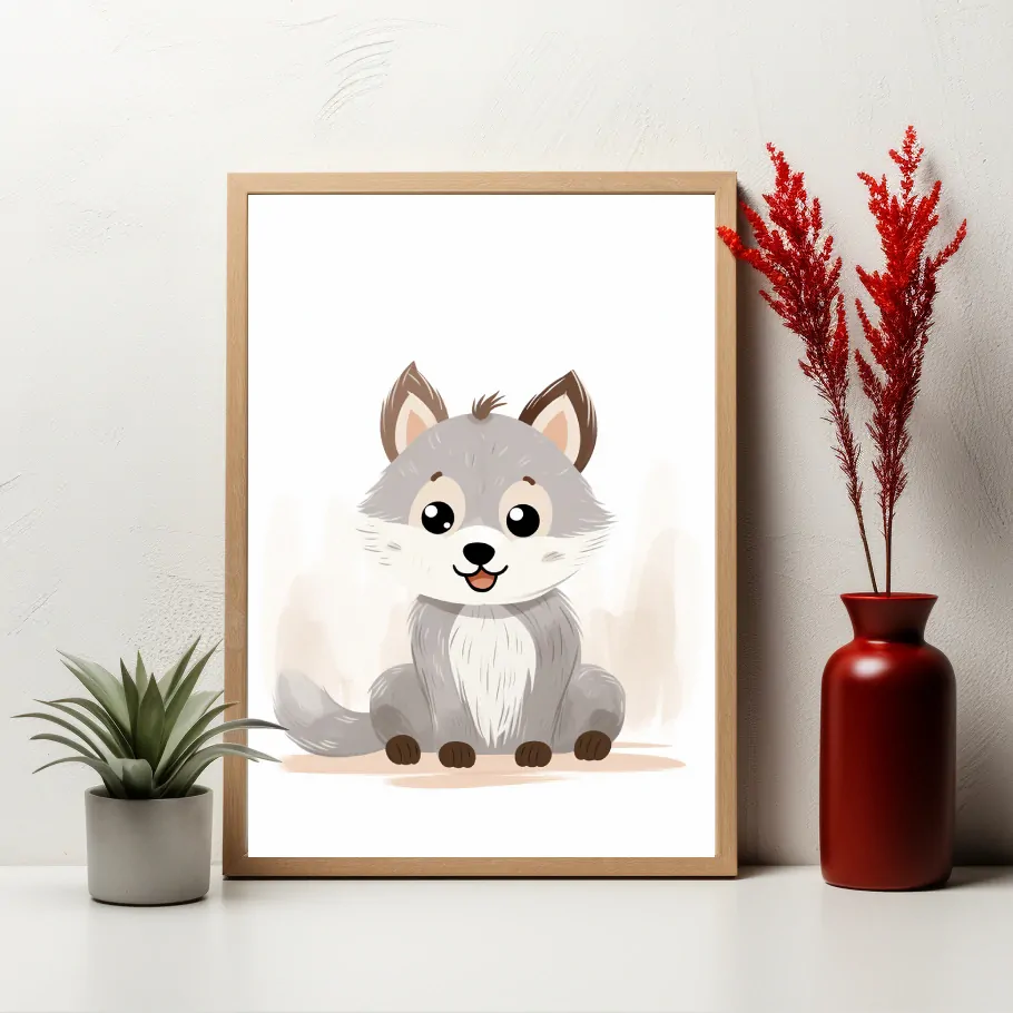 Tento obrázek je zobrazením roztomilého šedého vlčího mláděte, které sedí na zadních nohách. Vlčí mládě má velkou hlavu a malé tělo, s huňatým ocasem. Má šedou srst s bílými akcenty na hrudi, obličeji a tlapkách. Vlčí mládě se usmívá a má jazyk lehce vyplazený. Pozadí je světle béžové barvy s jemnou texturou. Tento obrázek je vhodný pro ty, kteří mají rádi roztomilá a veselá zvířátka.