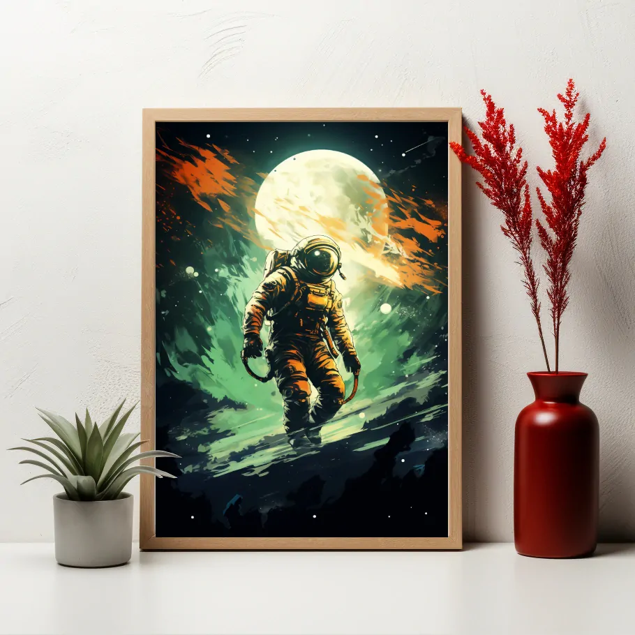 Astronaut pohlíží na Zemi z vesmírné vzdálenosti, připomínající si své kořeny. Měsíc na obloze mu nabízí pohled do minulosti a budoucnosti. Obraz evokuje smíšené pocity odvahy a nostalgie, které astronauti prožívají ve vesmíru.