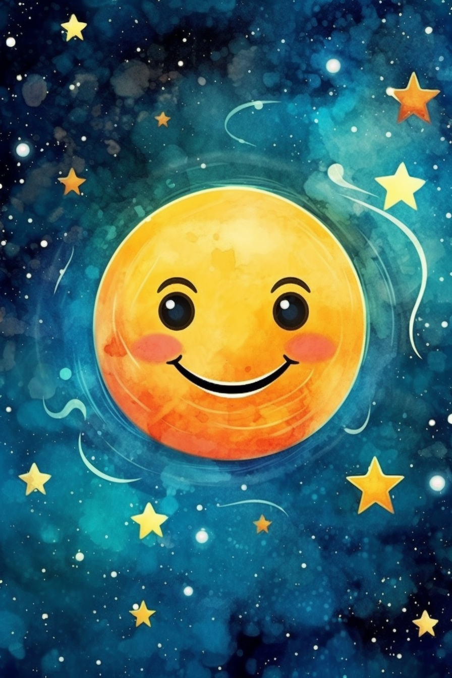 Usmívající se žlutá hvězda vystupuje na pozadí nekonečného vesmíru, přinášející radost a naději svým zářivým půvabem mezi hvězdami.