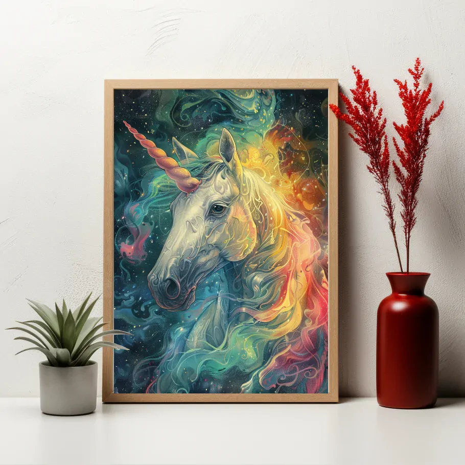Zářivý jednorožec je jako živá hvězda mezi zemskými tvory, jehož srst září jasněji než nejjasnější slunce na obloze. Jeho křišťálově čistý roh a lesklé oči vyzařují magickou sílu a krásu, jež přitahuje pohledy i srdce lidí všech věkových kategorií. V jeho přítomnosti se okamžitě rozplývají všechny starosti a obavy, neboť jeho světlo nás naplňuje radostí a nadějí.