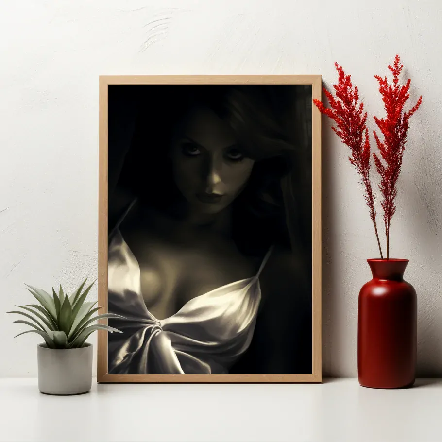 Pod hrou stínů a světla spočívá tajemství, zahalené ve větru bílé halenky. Žena ve stínu, jejíž tvář zůstává skryta, vytváří záhadnou a zároveň krásnou atmosféru. Velký výstřih vytváří optickou iluzi, jako by se z jemného závoje vytrácely kontury reality. Obraz "Závoj tajemství" nás zve k zamyšlení nad skrytými emocemi a nevyslovenými myšlenkami, které nás spojují s vnitřním světem této enigmatické postavy.