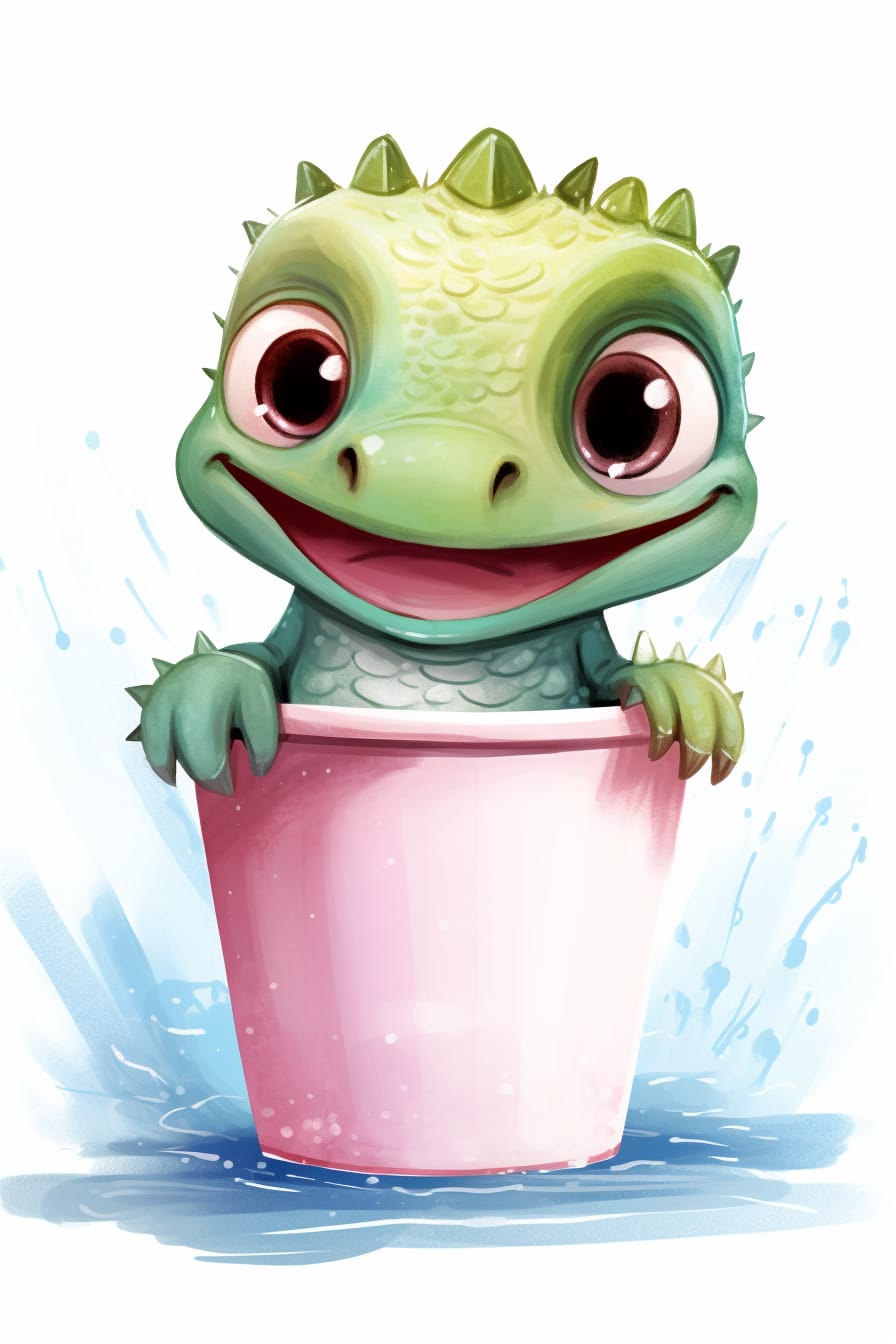 Na tomto kouzelném kresleném obraze posedává zelený dráček s radostným výrazem v růžovém květináči. Jeho krásné zbarvení krásně kontrastuje s růžovým pozadím, vytvářející harmonický celek, který vyvolává dojem pohody a radosti.