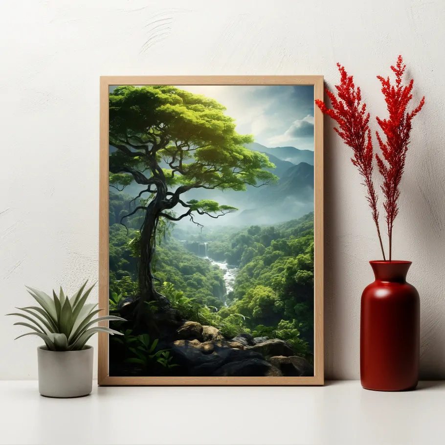 Velký zelený strom vyčnívá na útesu a střeží okolní krajinu, zatímco v pozadí se tekoucí řeka táhne mezi hustými lesy. Tento obraz zachycuje sílu a přirozenou krásu přírody.