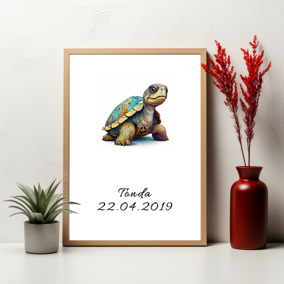 Osobní dotek umění! Objednejte si tento roztomilý obraz želvy a přidejte vlastní text, jméno nebo datum, aby byl jedinečným a osobním dárkem nebo dekorací.