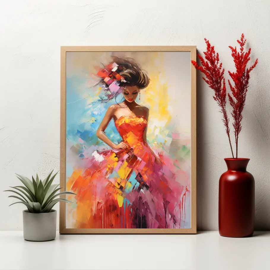 Plakát - Žena v růžových a oranžových šatech
