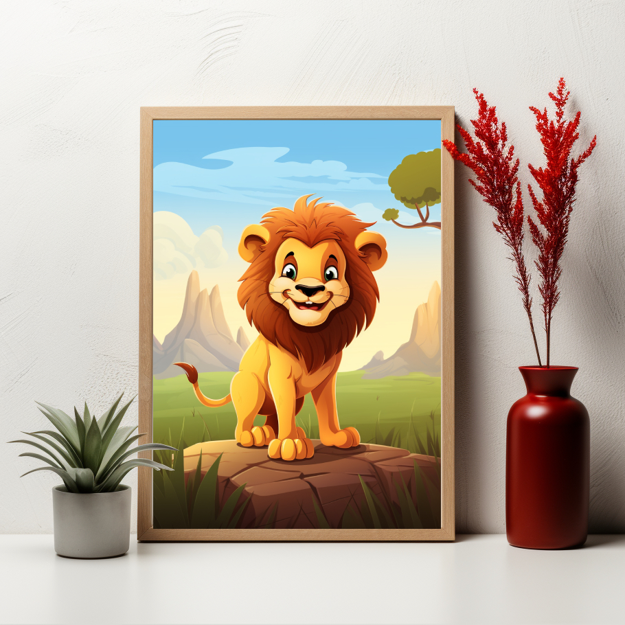 Na obraze je zachycen dětský lev, který se radostně vznáší nad krajinou. Zlatavá tráva se chvěje v lehkém větru, zatímco vzdálené vrcholky hor se ztrácejí v modravé dálce. Dětský lev, jehož jemný srst jiskří slunečními paprsky, vypadá hravě a plný života. Jeho oči září nadšením a odvahou, zobrazujícími sílu a bezmeznou fantazii dětství. Leví tlapky se dotýkají země s lehkostí, zanechávajíce za sebou jemné otisky. Celková atmosféra obrazu je naplněna radostí a nadějí, připomínající nám, jak důležité je zachovat si svůj vnitřní dětský svět a neztratit spojení s přírodou.